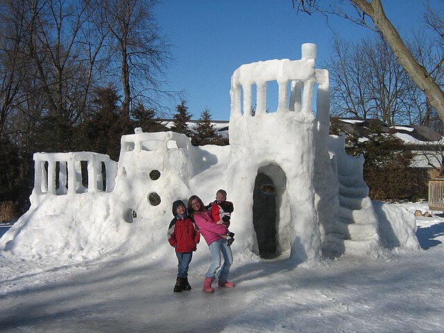 Build a snow fort Time: 5-minutes – 2 hours Materials: smallish boxes or tubs (optional) Activity: Examine a brick wall and how the bricks line up to make the wall. Lay out a circle or rectangle on the ground and mark a doorway. Show kids how to pack snow into a box or tub and